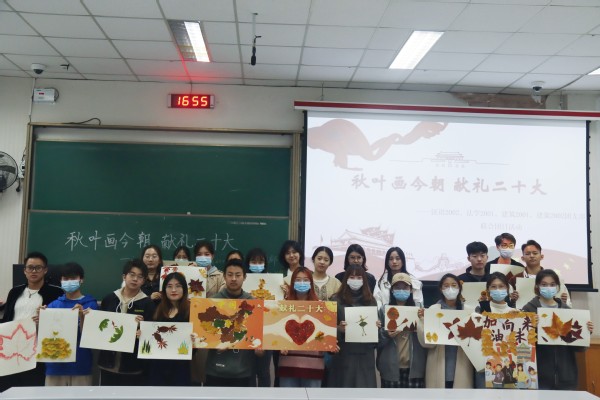 11月19日,为庆祝党的二十大胜利召开,向党的二十大献礼,高举中国特色社会主义伟大旗帜,全面贯彻习近平新时代中国特色社会主义思想,弘扬自信自强、守正创新,踔厉奋发、勇毅前行的伟大建党精神,汉语2002团支部联合法学2001、建筑2001、建筑2002团支部开展了题为“秋叶画今朝,献礼二十大”的团日活动。