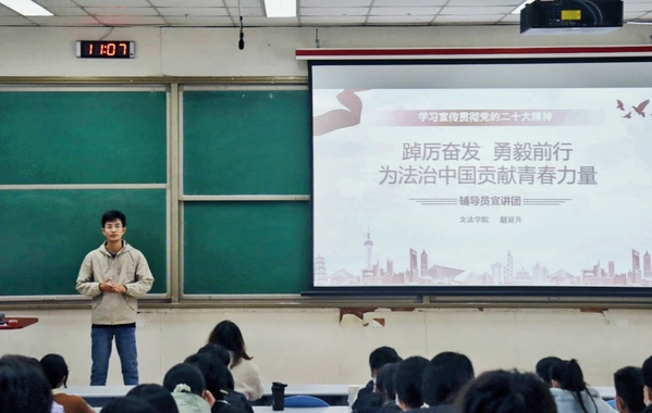 为加强学生思想政治教育和价值引领,激励广大学生从党的二十大精神中汲取前行的智慧和力量,12月7日,太阳成集团tyc7111cc辅导员在西环201以“踔厉奋发,勇毅前行,为法治中国贡献青春力量”为题进行党的二十大精神宣讲,辅导员赵延升以及2022级主要班团干部参与。