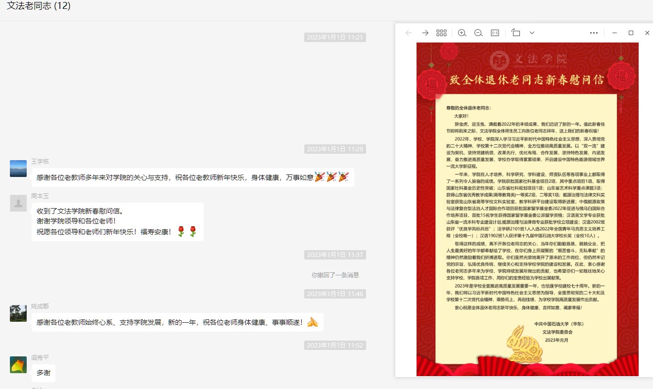 院领导通过线上交流的形式关怀慰问退休教职工,仔细询问老教师们的身体和生活情况,感谢老教师们为学校、学院的发展建言献策、贡献力量,介绍了学院当前的重点工作和取得的成绩,并送上新春祝福。老教师们对学院的关心和问候表示感谢,对学院发展的新变化、新面貌感到欣慰,祝愿学校、学院各项事业欣欣向荣,取得更大成绩。