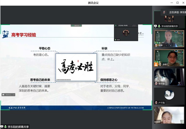 首先,队员周墨放映了中国石油大学(华东)2022年招生宣传片——《少年•光》,参会学生通过宣传片概括性地了解了石大发展历史与学科概况。而后此次宣讲会主持人、宣讲队队长翟瑞雪宣布宣讲正式开始。由队员李东阳首先介绍中国石油大学(华东)的发展历史与优势,并通过最近的热点话题——曾景斌教授带领石大科研团队自制抗原检测试剂盒战疫情,让邢台一中学子对中国石油大学的办学水平与教师队伍等有了更为清楚的认识。而充满情趣的校园生活更引起学生兴趣。随处漫步的猫咪、菜品丰富的食堂、敞亮的现代图书馆,多彩优质的社团活动……彰显着石油大学的办学实力与独特风情。