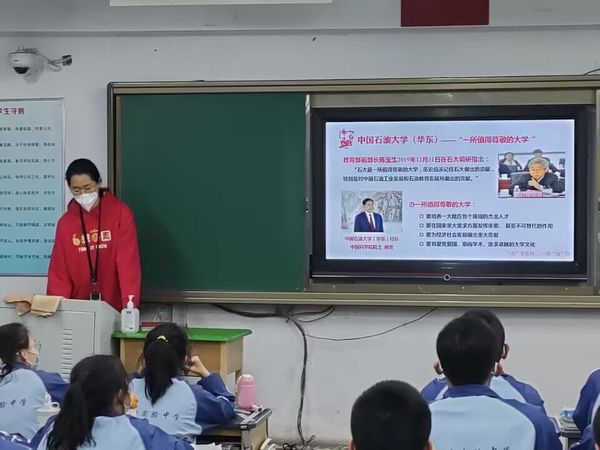 会议伊始,天山队为实验中学学生播放《少年·光》宣传片,片中回顾中国石油大学(华东)69年的光辉岁月,展现出学校的深厚底蕴和文化氛围,同时也表达了对优秀同学的欢迎。青岛遇见山海,石大预见未来,其次由天山队队长刘润馨讲解中国石油大学(华东)一路走来的发展历程,中国石油大学(华东)诞生于新中国最需要之时,69年来致力于祖国的能源建设,为祖国培养出优秀的人才,是一所值得尊敬的大学。同时刘润馨在PPT上为同学们介绍石大的著名校友,当场下的同学们看到教科书上的科学家一一出现在眼前时,不由发出惊叹,并从心底里敬佩中国石油大学(华东)。