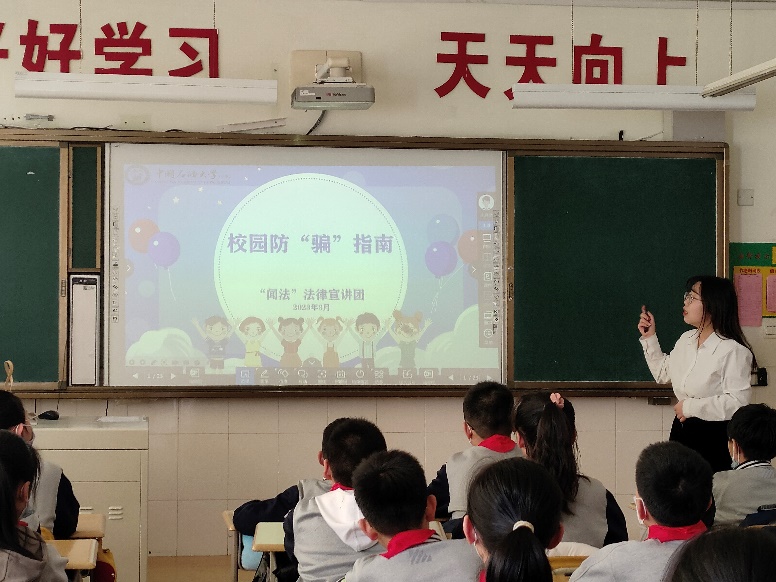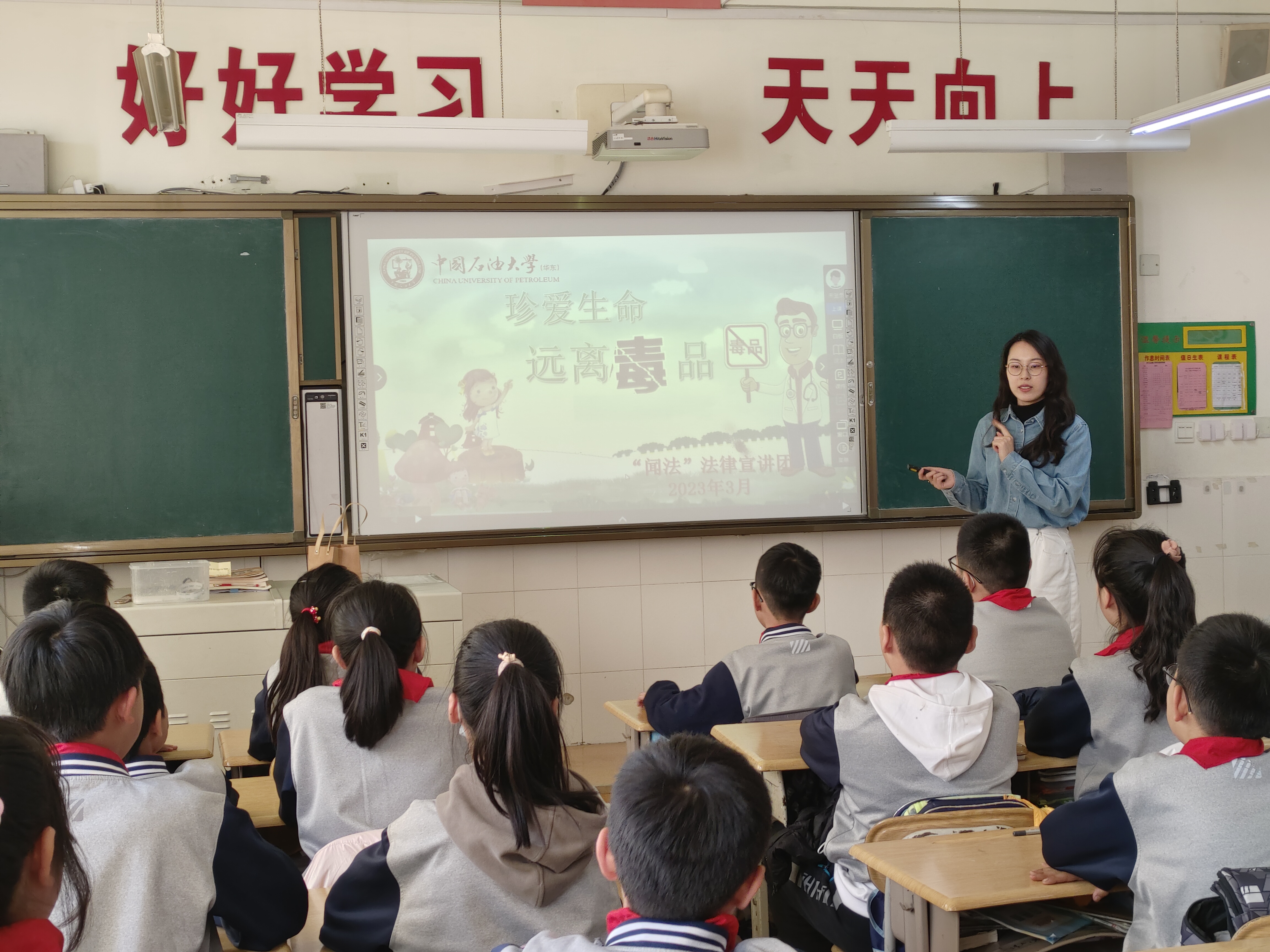 为进一步强化青少年的法律意识和法律素质,提高学法、知法、懂法、守法的自觉性,弘扬法治精神,2023年3月1日,中国石油大学(华东)文法法律宣讲团走进青岛西海岸新区太行山路小学,为五年级七班的同学开展以反诈骗与禁毒等方面的为主题为五年级七班的同学展开宣讲。