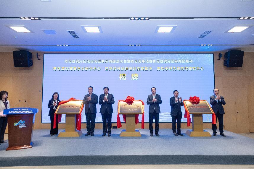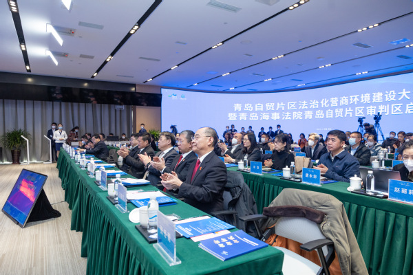 3月1日,青岛自贸片区举行以“法润自贸,营商益企”为主题的法治化营商环境建设大会,青岛市委常委、政法委书记、市优化营商环境工作专班负责人程德智出席并致辞。市中级人民法院院长张正智,市人民检察院检察长段连才、青岛海事法院院长吴锦标、青岛自贸片区管委主任赵士玉、市司法局局长邓焕礼、市优化营商环境工作专班办公室主任路玉军,以及市委政法委、市中级人民法院、市人民检察院、青岛海事法院,市政府办公厅、市自贸领导小组办公室、市贸促会、市仲裁办、市法学会和黄岛区人民法院、人民检察院等有关领导出席活动。我院副院长冷凌应邀参会。作为全国海事法院首个设立的自贸区审判区——青岛海事法院青岛自贸片区审判区在本次大会上顺利揭牌,另外青岛国际商事争议解决中心、青岛中世合规自贸研究中心、自贸涉外法律培训基地同步落地。