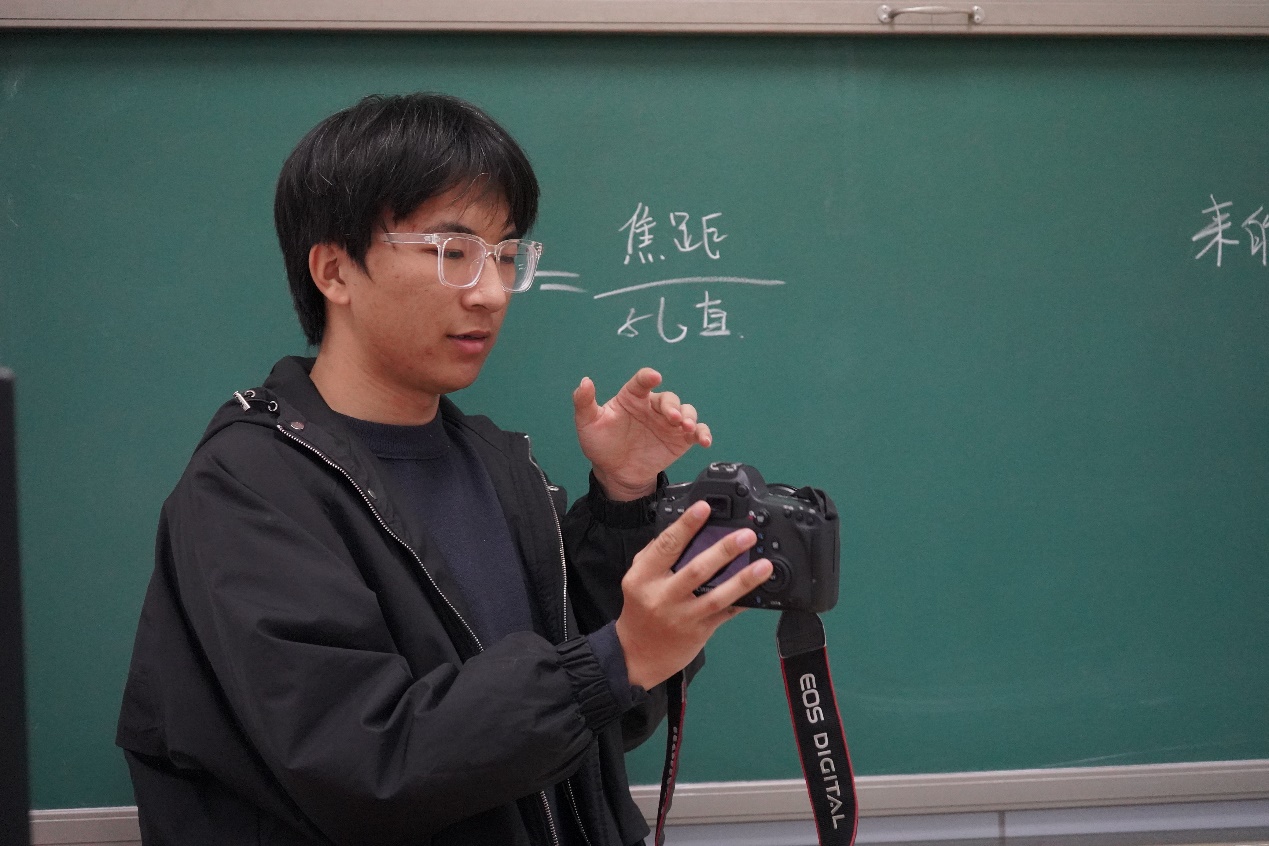 培训会议首先由王鸿波进行摄影培训——如何拍好一张照片。培训依次从三个方面进行,分别是重新认识一台相机——“相机的构成有哪些,怎么正确使用”,摄影的三个重要参数——“摄影的三要素是什么,怎么调好三要素”,如何应对不同的摄影场合——“不同场合选用不同的角度,怎么选好角度”。与此同时,王鸿波结合着摄影实例与同学们分享自己在摄影中的心得体会和独门技巧并为同学们答疑解惑。