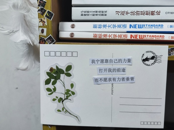 法学2201班级以“捡拾经典碎片,拼接春日之诗”为主题开展读书日活动。通过拼贴剪裁的方式,学生发挥创意、挥洒诗意,制作独一无二的“春日拼贴诗”。“善与恶、美与丑、高尚与卑下/主要靠内心信念/内心自律是美德。”法学2201班级陈书雅利用废弃课本创作拼接诗。