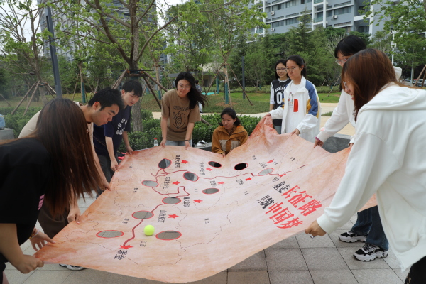 为重温红色历史文化,参悟继承先辈们的红色品质,法学2203、法学2101团支部开展了“重走长征路”趣味团辅活动。支部成员双手拉住地图的边缘,控制网球在长征地图上翻滚,不能让网球滚落地图中的陷阱。每跨过“艰险”到达新的目的地,组织委员李海清就会为支部成员解说红军在此经历的红色历史故事。此项活动将趣味性与历史性相结合,模拟了长征路途的艰险,使支部成员了解了长征的艰难历程,更加感受到革命先烈的坚定信念。