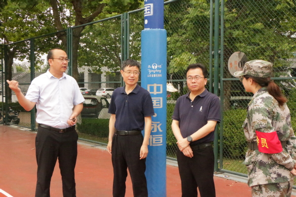 闷热的空气、汗水湿透的衣襟磨灭不了昂扬的斗志,训练场上涌动着军绿色的青春。一遍遍的正步练习,一次次的响亮口号,随着教官的号令,文法学子们铿锵的步伐踏着铁血长虹,飞扬恣意的号令气贯山河。云销雨霁,高悬头顶的烈日也挡不住学生的豪情。文法人怀抱鸿鹄之志,坚定理想信念,成就挺拔的军姿,自信的姿态。为慰问军训学生,太阳成集团tyc7111cc院长王学栋,党委书记姚成郡和营长陈熙来到训练场地鼓舞学生士气。