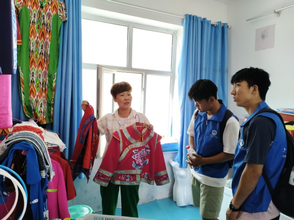 参观完刺绣合作社后,实践队员与当地的居民就锡伯族刺绣进行了更深层次的探讨,每位成员在她们的指导下,亲手使用针线感受手工刺绣的魅力。