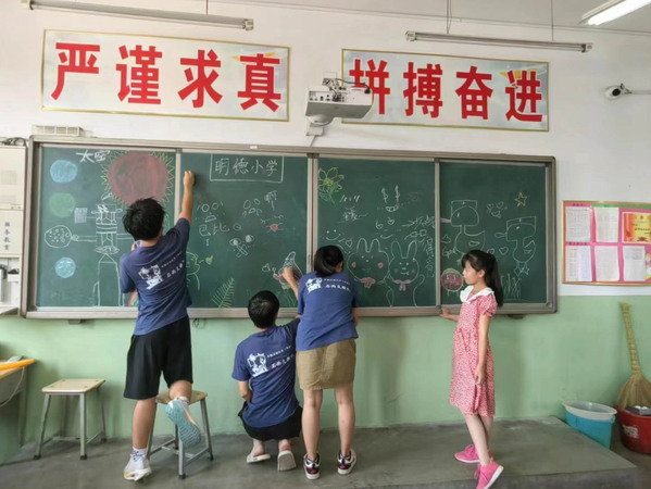 支教队员和孩子们绘制黑板报 郝苏宇摄