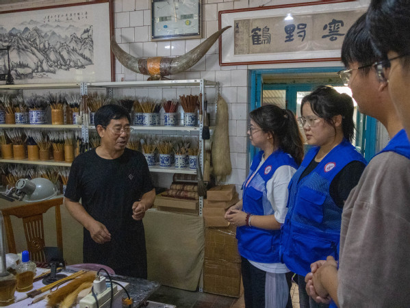 毛笔制作技艺传承人滕占锁向实践队员讲解毛笔制作 李双羽摄