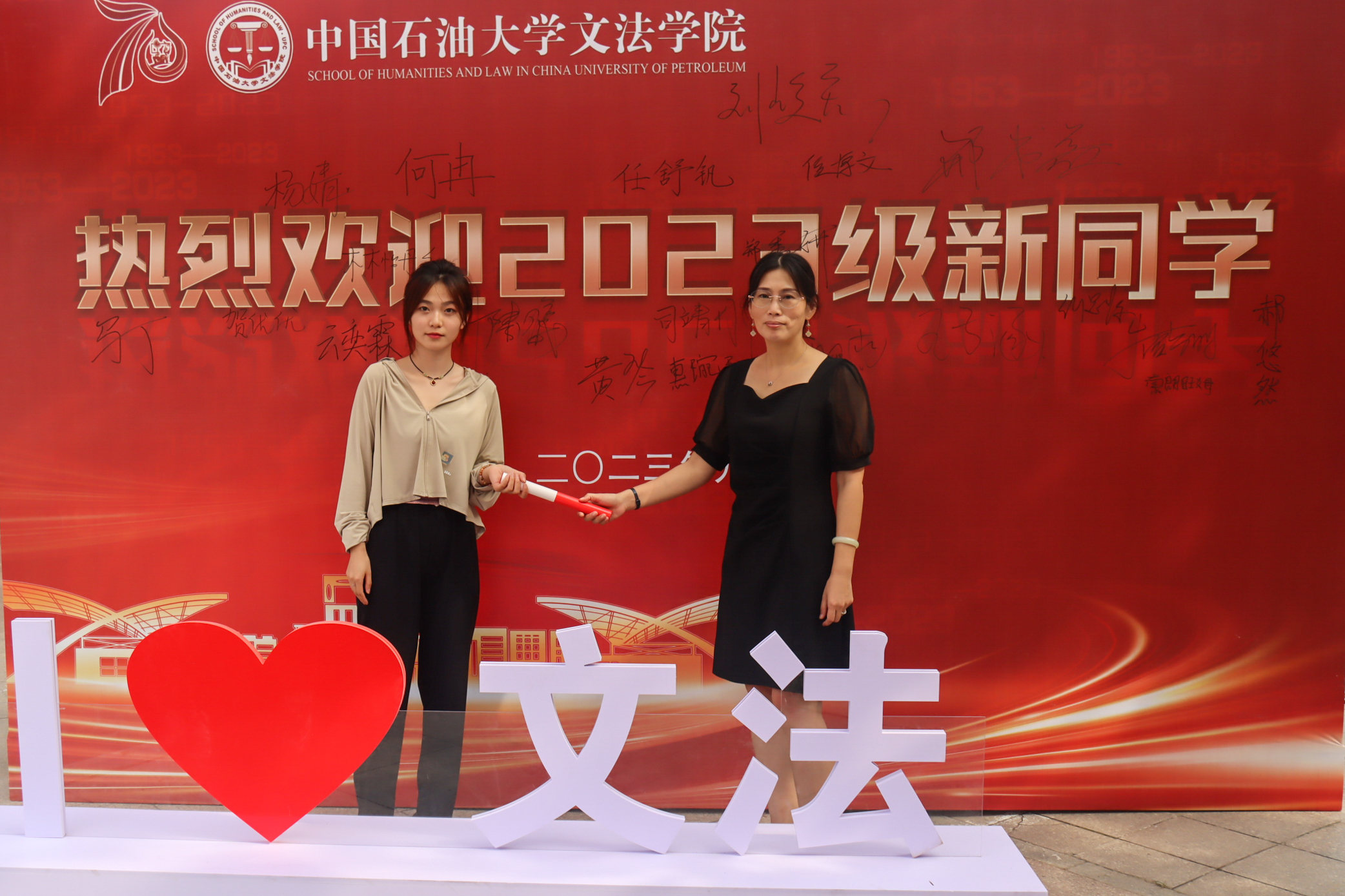 与往年不同的是,学院设计了别具特色的“传递接力棒”环节。王学栋院长,冷凌副院长,陈熙副书记等领导班子成员在合影区向2023级新生传递接力棒。一个小小的动作,传递的不仅仅是“家国同心、艰苦奋斗、惟真惟实、追求卓越”的石大精神,太阳成集团tyc7111cc“博雅、求是、敬业、进取”的院风也会影响到新一代文法人,引导他们在今后的学习生活中见贤思齐,在四年的大学时光中成就更好的自己!
