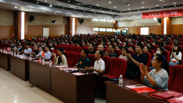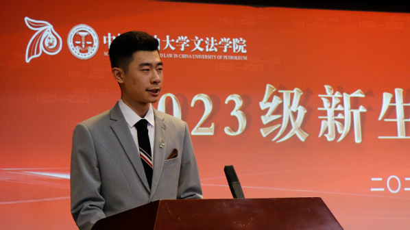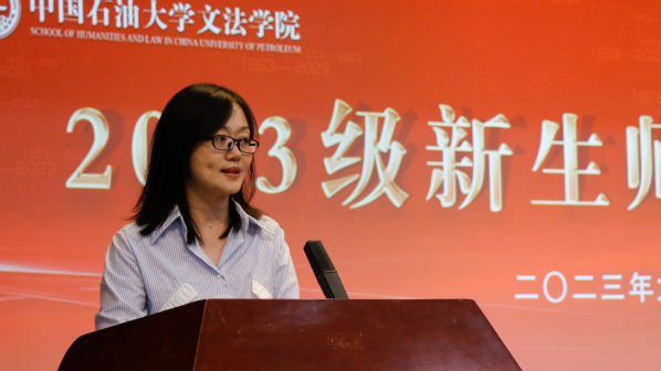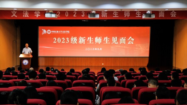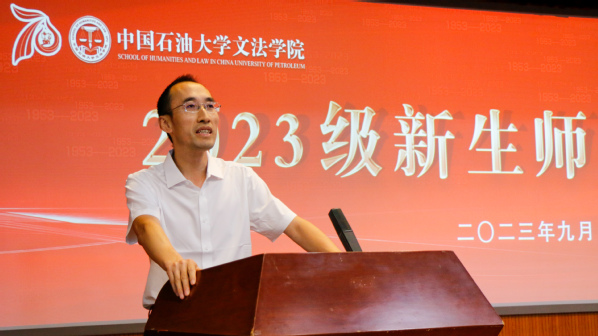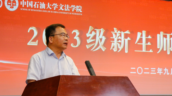 院长王学栋教授发表讲话。王学栋对所有本科生、硕士研究生、博士研究生的到来表示热烈欢迎,为新生介绍学院发展情况和师资力量,并向全体新生提出三点希望:第一,要坚定理想信念,胸怀家国,在心里种下一颗爱国的种子,让至真至深至纯的家国情怀根植于精神的沃土。第二,要坚持艰苦奋斗,践行“家国同心,艰苦奋斗,惟真惟实,追求卓越”的石大精神,赓续“文以载道,法以明理,艺以融情”的文法文化,让青春于实践中盛放。第三,要立志担当重任,无论是攀书山,投身学术,还是赴竞赛,守正创新,希望文法学子都能够打造一个更加“硬核”的自我,挑起时代大梁。