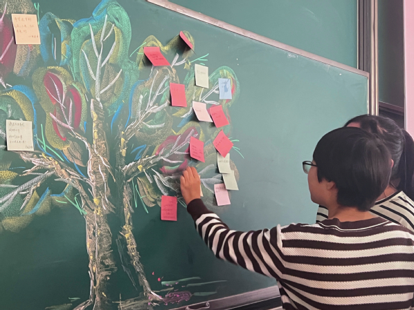 在活动最后,共同完成心愿树环节将本次活动氛围推向高潮。团支部书记刘佳怡和副书记孙熙谌分发多彩便签,让参会成员在便签上写下新学期对自己的期望和本学期想要达成的目标,并上台粘贴在心愿树上。刘佳怡详细讲解了活动形式,倡导成员们通过利用许愿条,将自己的愿望和心声以文字的方式记录下来,并把许愿条粘贴到由汉语2201团支部成员张连航绘制的“心愿树”上。在支部成员的共同配合下,“心愿树”活动圆满完成,它不仅承载着成员们对未来的向往,更是给予自己心理的安慰,指引了前进的方向。