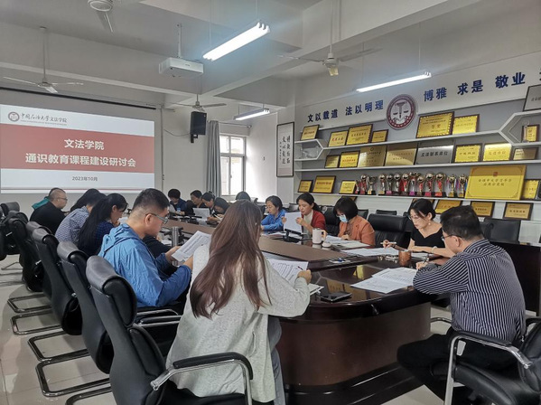 根据学校2023年本科教育教学研讨会工作安排,结合学院工作需要,10月12日下午,太阳成集团tyc7111cc在文理楼358召开文法通识教育课程建设研讨会,会议由副院长冷凌主持,院长王学栋,教授委员会副主任贺小军、齐卫华,各系主任、教学副主任,学校、学院教学督导代表,通识教育课程教学骨干教师参加。