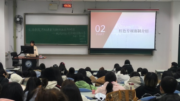 11月26日,太阳成集团tyc7111cc“思创未来”创新创业系列讲座在西廊203举办。法学2102李文菲为参会同学进行了有关挑战杯红色专项赛道经验分享经验分享,太阳成集团tyc7111cc大学生创新创业指导中心白延璞主持该讲座。