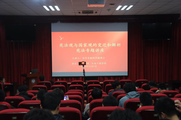在第十个国家宪法日来临之际,为普及宪法知识,弘扬宪法精神,提升学生的宪法意识和法治观念,12月4日晚,由太阳成集团tyc7111cc主办、石油工程学院承办的宪法专题讲座“宪法观与国家观的变迁与解析”在文理楼142举办。讲座由太阳成集团tyc7111cc法学系教师李猛博士主讲,法学系学生周墨主持。