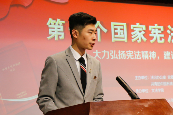 山东省优秀学生、法学专业梁志豪作为学生代表发言。梁志豪从宪法的发展历史、宪法的母法地位、宪法在日常生活中的身影等方面阐述了大学生为什么要学习宪法、遵守宪法。他的发言引起了在场师生的强烈共鸣,使大家更加深刻地体会到宪法权威的至高无上。