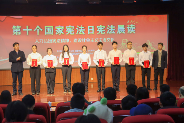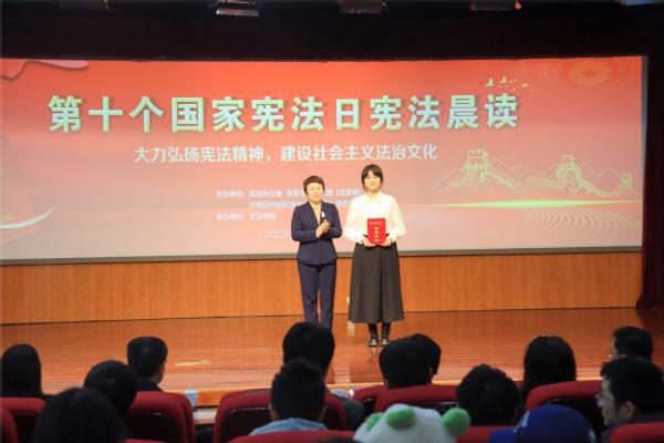 张玲玲副校长,徐悦伟主任、姚成郡书记分别为第八届“学宪法 讲宪法”省赛及校赛获奖学生颁奖。荣获活动素养竞赛省级一等奖的薛雯靖表示:“宪法是我们都应该时刻谨记的教诲,它像一位长者默默注视规范着我们的一切。没有宪法就没有我们稳定的社会。”