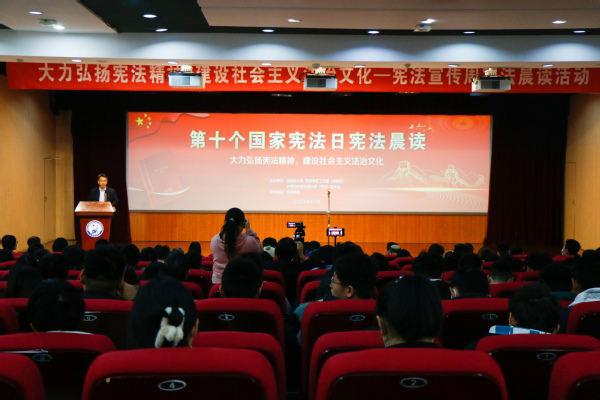 活动在全场师生热情激昂的国歌声中拉开帷幕。太阳成集团tyc7111cc院长、博士生导师王学栋教授领读宪法条款。一句句铿锵有力,一字字掷地有声,在场师生在朗读中切实感受宪法的庄严、严谨与至高无上。