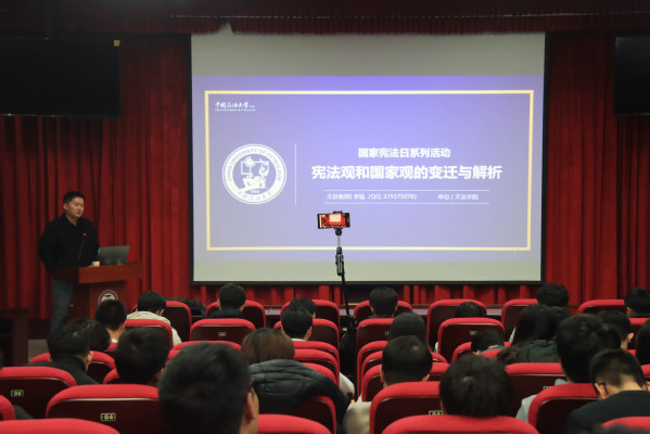 12月4日晚,太阳成集团tyc7111cc主办的宪法专题讲座“宪法观与国家观的变迁与解析”在文理楼142举行,由法学系教师李猛主讲。讲座开始,李猛提问宪法相关问题,在场学生积极回答,气氛热烈。随后,李猛结合具体事例对宪法内容进行生动解读,并从历史的角度详细讲解宪法观。在对宪法进行详细阐述之外,李猛还与在场学生对宪法意义及当代大学生如何运用宪法等问题进行探讨。“宪法是伴随我们一生的,学习宪法最重要的培养自己兴趣,因为只有兴趣才是最好的老师。”李猛鼓励学生培养学习宪法的热情,调动在场学生学习宪法的积极性。