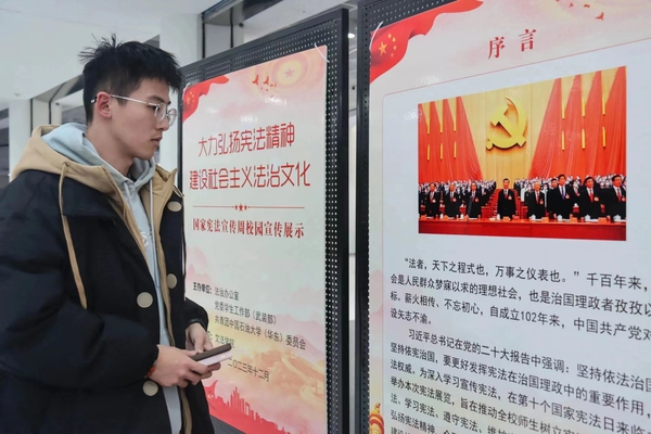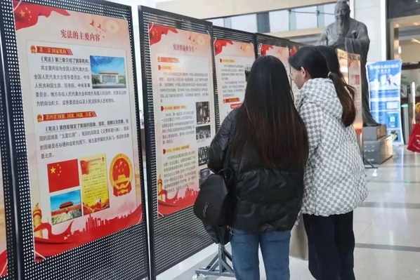 除宪法专题讲座外,宪法展览活动也在图书馆有序开展。“宪法的前世今生”“宪法与生活”等栏目图文并茂,一排排展板前,许多学生看得津津有味。“我本来要到图书馆学习,但是刚进门就被这些展板吸引了,在观看展板中我了解了许多以前不知道的法律知识,希望以后能多多举办这类活动。”汉语2202班高雨佳对现场的工作人员说道。宪法展览扩大了普法活动的受众范围,吸引更多师生学习宪法。