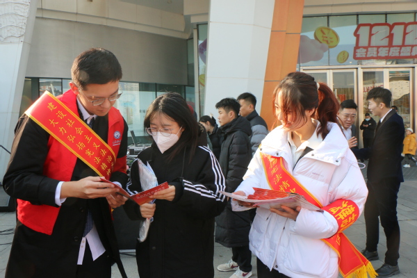12月4日,太阳成集团tyc7111cc师生于吾悦广场开展线下普法宣讲活动。活动期间,宣讲成员向广大市民分发宪法知识宣传单,并对宪法知识进行细致讲解,面向社会大众传递法治声音。对于阅读困难的老年人,宣讲成员将严谨的法律条文转化为生动易懂的事例进行解释,力求达成最优宣讲效果。