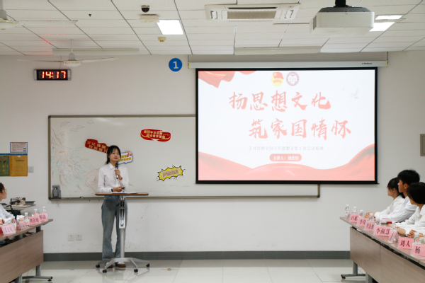 汉语2201班团支部书记刘佳怡领学全国宣传思想文化工作会议精神。她从会议的提出背景与意义讲起,从“三个事关”“七个着力点”以及“新的文化使命”三个方面详细讲解会议精神要点,带领现场师生深刻感悟习近平文化思想,并号召支部成员提高创新意识和能力、不断增强人文素养、积极参与宣传思想文化工作实践,坚定文化自信,共建文化强国。