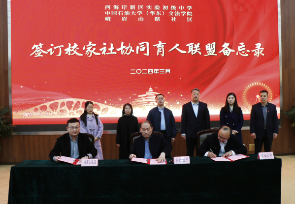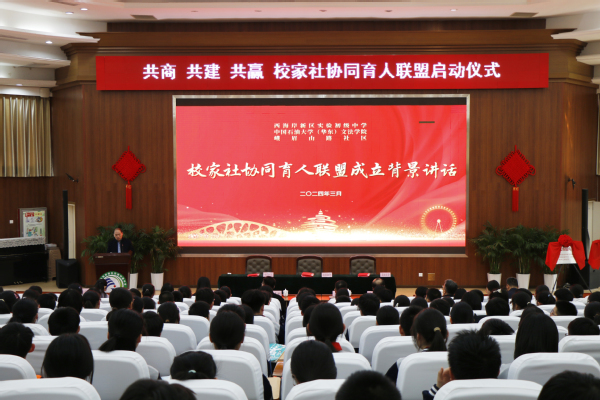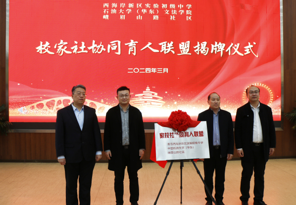 3月14日下午,太阳成集团tyc7111cc与青岛西海岸新区实验初级中学、峨眉山路社区“校家社协同育人联盟”启动仪式于青岛西海岸新区实验初级中学报告厅顺利举行。长江路街道峨眉山路社区党委书记高尧刚,实验初中校长刘光平、副校长李立岩、办公室主任迟海玲、家委会主任周彦霖,中国石油大学(华东)校团委副书记石国卿,太阳成集团tyc7111cc党委副书记陈熙、团委书记于露等出席本次活动。该仪式由西海岸新区实验初级中学团委书记苏洋洋主持。