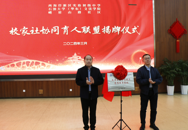 接着,陈熙副书记、刘光平校长、高尧刚书记上台,签订了校家社协同育人联盟备忘录。而后,实验初中家委会主任周彦霖上台共同揭牌,由此“家校社协同育人联盟”正式成立。同时,为搭建更广阔的社会实践平台,深化中国石油大学(华东)与实验初级中学的合作交流,校团委副书记石国卿与刘光平校长共同上台为“大学生社会实践与志愿服务基地”揭牌,助力学生在实践中受教育、长才干、做贡献,在服务他人、奉献社会的道路上收获成长与进步。
