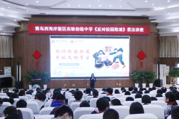 与座谈会召开同时,报告厅内由中国石油大学(华东)文法法律宣讲团负责人李甜雨作题为《反对校园欺凌》的普法讲座。李甜雨从介绍校园欺凌的性质及其表现形式、预防和应对校园欺凌的方法等几个方面向实验初中的学生们进行了具体而又生动的讲解。通过这次宣讲,增强了实验初中的学生对校园欺凌行为的认识,提高了学生对于反对校园欺凌的意识。
