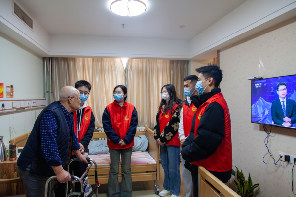 活动伊始,支部成员立足老人实际需求,向老人分发牛奶等慰问礼品,主动献爱心、送温暖、助他人,助力提高老人的生活条件。随后,支部成员组建文艺表演团队,为老人们带来快板、新疆舞、歌曲等形式多样、内容多彩的文艺节目,活跃现场气氛,丰富老人生活,提振老人情绪。为拉近与老人的距离、吸引老人积极参与,支部成员歌唱《我和我的祖国》《我的祖国》《北京的金山上》等经典红歌,老人们打起节拍、一同跟唱,在悠扬旋律中呼唤民族情感,在活跃氛围中加深彼此情谊。活动最后,支部成员搀扶老人回到各自房间并与其亲切交流、悉心交谈,将爱心付诸行动,以热情点燃欢乐,用陪伴传递温暖。“网红‘火龙果’奶奶”崔奶奶等老人与支部成员友好交流,向支部成员介绍自己的家庭、经历与在护养院的生活日常,询问支部成员的学习情况并鼓励支部成员努力学习、珍惜大学平台、实现自己的理想。