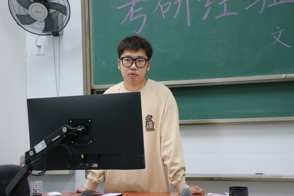 第三位分享者是来自汉语言2001班的王天昊,他成功考入中国人民大学。王天昊从自身实际经历出发、以自己所见所闻举例展开分享。面对如何择校和选专业的问题,他以自身为例,从个人条件和兴趣、院校特点、命题特点、分数线四个角度详细介绍如何综合考量并选择。在资料收集方面,他也提出了自己的许多看法。他认为,选择资料时一定要注重其实际作用,不要执着于手写笔记,“囤笔记”行为毫无意义的,应多去比较选择最适合自己的资料。另外,要敢于提问,“拐弯抹角式”提问效率低下不可取。除此之外,他还分享了许多优质公众号,并推荐优质书单。