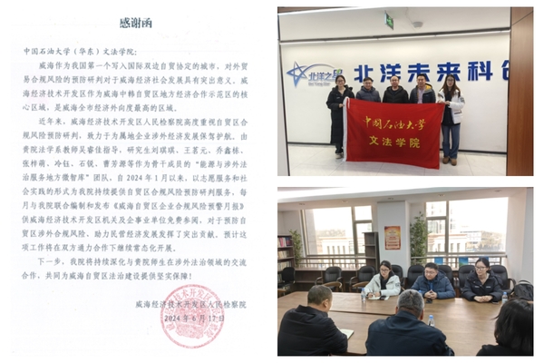 感谢函中指出,由学院教师吴睿佳指导、研究生刘琪琪等作为骨干成员的“能源与涉外法治服务地方微智库”团队,以志愿服务和社会实践的形式为威海经开区检察院持续提供自贸区合规风险预防研判服务,每月联合编制和发布《威海自贸区企业合规风险预警月报》,供威海经济技术开发区机关及企事业单位免费参阅,为预防自贸区涉外合规风险、助力民营经济发展做出了突出贡献。未来,学院将与威海经开区检察院继续深化自贸区合规风险研判领域的合作。