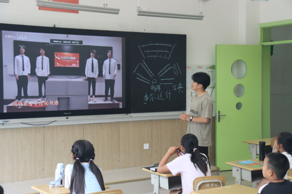 为了让孩子们更加直观地感受音乐的魅力,实践队员刘峻宏身着正装,手持小提琴,为孩子们带来了一场精彩的现场演奏。一曲《孤勇者》悠扬响起,激昂的旋律穿透了时空的界限,触动了孩子们的心灵。随后,刘峻宏又介绍了中国小提琴演奏大师吕思清及其经典作品《梁山伯与祝英台》,并亲自示范演奏,让孩子们在悠扬的琴声中领略到了中国传统文化的韵味与魅力。