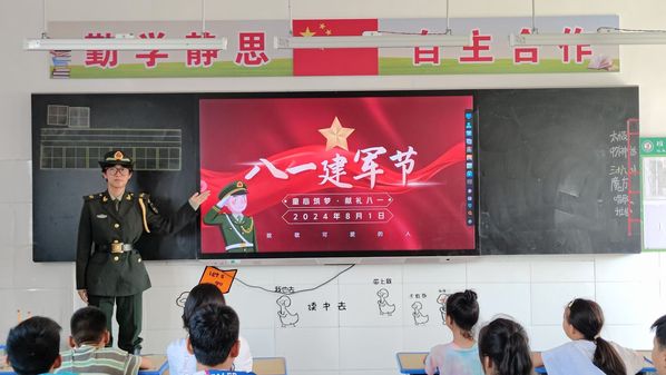 值得一提的是,今天支教队还进行了专题教育—国防教育,该活动的组织单位由中国石油大学(华东)国旗护卫队和鲁豫相约支教队联合举办,活动形式丰富多样,共含有五个活动板块:首先连线国旗护卫队队长进行相关分享,之后科普建军节相关知识,同时还不忘增加与学生的互动,如让学生体验升旗、模拟军事训练等等。