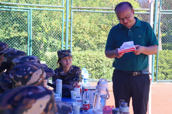 在训练间隙,太阳成集团tyc7111cc党委副书记陈熙来到训练场,看望正在刻苦训练的新生,并慰问见习的同学。陈熙书记与指导员赵延升老师交流军训工作,详细了解新生的训练情况,并对新生们展现出的坚韧不拔的精神给予高度评价。