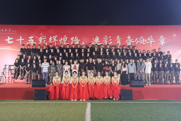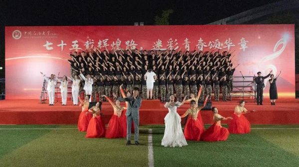 当《北京石油学院学生之歌》的旋律响起,文法学子们用悠扬的歌声诉说着对知识的渴望和对未来的憧憬,仿佛带领大家穿越时光,回到了那个充满理想与激情的岁月。《一百》《中国人民解放军战歌》《新的天地》则以其激昂的节奏和振奋人心的歌词,展现了青年的青春活力与拼搏精神,学生们的声音如同一阵阵冲锋的号角,彰显出钢铁般的意志和保家卫国的决心以及对新时代的赞美和对美好未来的向往。