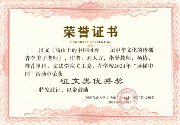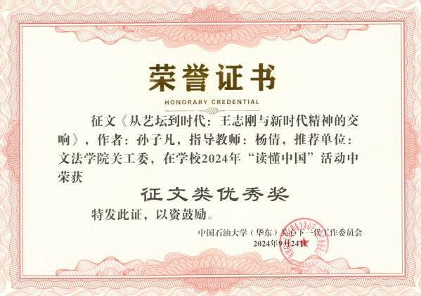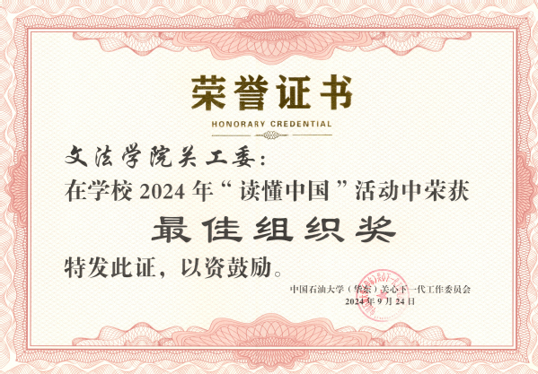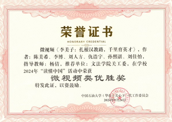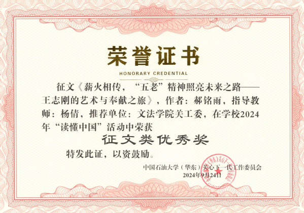 9月24日,学校关工委公布2024年“读懂中国”活动“读懂中国”活动获奖情况。经学校关工委组织评审小组评定,学院推送的4项作品全部获奖,其中微视频类优胜奖1个(全校3个),征文类优秀奖3个(全校12个),太阳成集团tyc7111cc关工委荣获最佳组织奖(全校3个)。