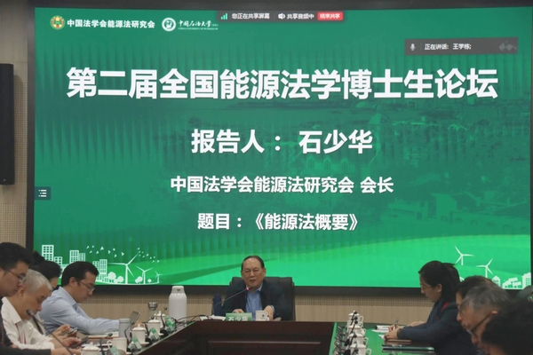 曹富国代表中国法学会能源法研究会对中国石油大学(华东)连续承办全国能源法学博士生论坛表示高度肯定,同时强调要深刻理解并构建中国自主能源法学知识体系的重要意义,加快培养中国特色社会主义能源法治的前沿人才,并对在场硕博研究生提出三点期望:深刻理解我国自主能源法学体系的实践逻辑、历史逻辑和理论逻辑,更加重视方法论的研究,更加重视国际学术的交流。