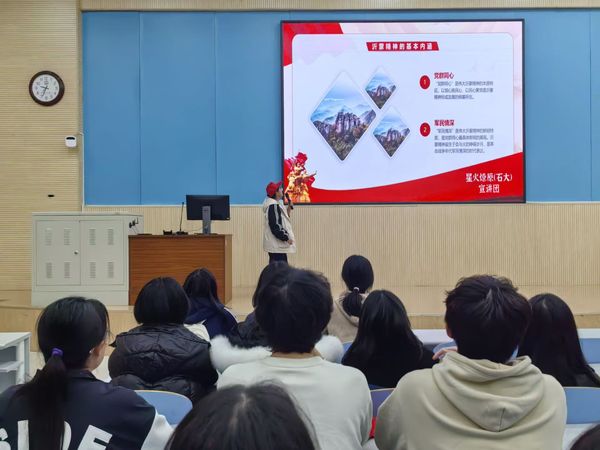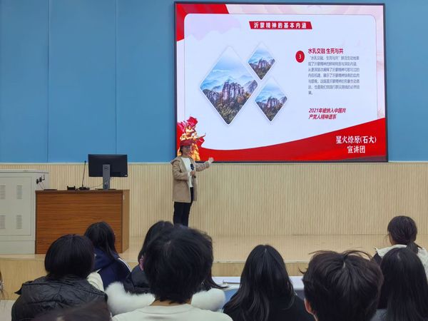 “星火燎原”宣讲队付冰冰借助精心筹备的多媒体展示资料,徐徐展开了一幅沂蒙地区波澜壮阔的历史长卷。从沂蒙山区那钟灵毓秀却又饱经沧桑的地理风貌切入,进而深入到艰苦卓绝的革命斗争年代。付冰冰以详实的史料、生动的讲述,清晰勾勒出沂蒙人民在战争时期所展现出的无畏与坚韧。那一幕幕沂蒙人民踊跃支前的画面,仿佛穿越时空,鲜活地呈现在众人眼前——他们倾其所有,送儿送郎参军,肩挑背扛着物资奔赴前线,为革命胜利不惜奉献一切。这正是沂蒙精神“爱党爱军”内涵的生动诠释,沂蒙人民对党的忠诚、对军队的拥护,如同璀璨星辰,照亮了那段烽火岁月的前行道路。