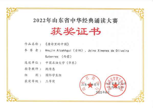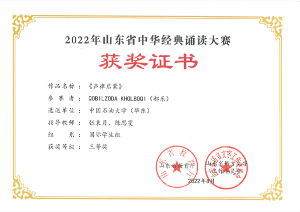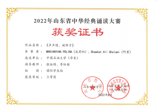 近日,山东省教育厅、山东省语言文字工作委员会公布了2022年全省中华经典诵读大赛获奖名单。我院教师张袁月及汉语国际教育专业研究生鲍传惠、张淑晴、李钰铭、陈思雯指导了三组留学生参赛,参赛作品《唐诗里的中国》《声律启蒙》《声声慢+破阵子》均获国际学生组三等奖。