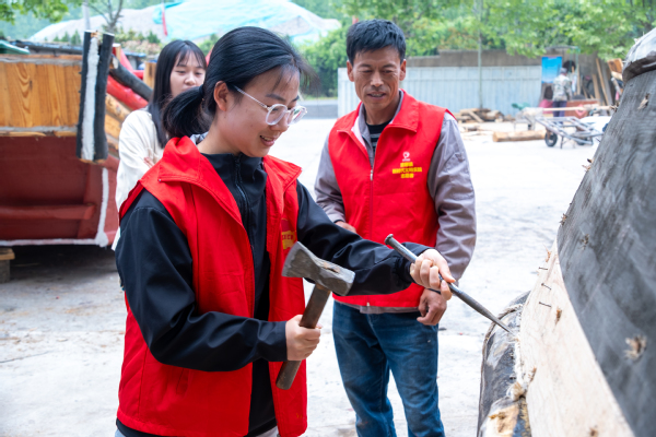 活动当天,王暖叶热情接待了法学2403团支部的学生们。他带领学生们深入船舶制造车间,系统讲解木船从选材、设计到组装的二十余道工序,并现场演示传统造船技艺中的关键技术——捻缝防水工艺王暖叶向学生们示范规范动作,将麻绳用斧头錾子锤进船体木板之间的缝隙,再用艌料确保缝隙被完全填满,法学2403团支部成员专业指导下动手尝试,麻绳的粗粝与斧头的沉重让许多人体会到传统工艺的艰辛。“看似简单的动作,实际操作却需要全身协调发力,稍有偏差便需返工。”团支部成员亓连洁感慨道。