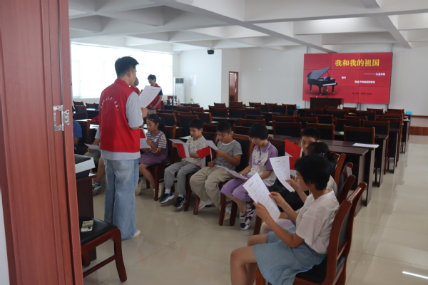 《我和我的祖国》合唱环节中,志愿者们向孩子们传授歌曲理念和乐理知识,每个孩子都全心贯注。伴随着悦耳的琴声,稚嫩的童声逐渐从羞涩到嘹亮,在“我和我的祖国,一刻也不能分割”的歌声里,孩子们眼中闪烁的光与墙上的党徽交相辉映,深深的爱国情怀融入优美的旋律。