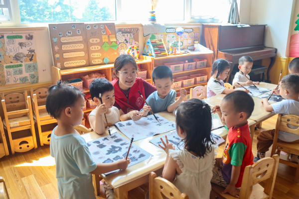 志愿者李琦以亲切提问开场:“小朋友们,有没有人会写自己的名字?有没有人见过毛笔?有没有人愿意跟老师学习写毛笔字?”孩子们的注意力被迅速吸引,踊跃举手,反响热烈。