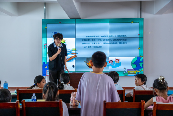 志愿者结合夏季多发灾害,用图文卡片讲解应急避险知识。“洪水来了要往高处跑”“地震时先躲在桌子底下”“遇到危险要大声呼救”,一句句简洁易懂的口诀伴随着标准的动作示范,让孩子们看得认真、学得投入。