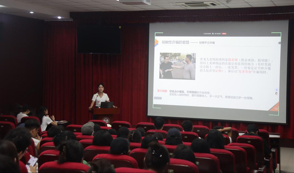 作为会议的首个环节,2024级法学专业硕士、文法法律宣讲团团长王红艳为新生带来一场主题鲜明的反诈宣讲。她结合法律知识和校园生活实际,深入剖析了网络刷单、冒充熟人、虚假兼职等诈骗手段,并通过鲜活案例提醒同学们保持高度警惕,避免因轻信而造成财产损失。她强调,作为新时代的研究生,要学会用法律思维维护自身权益,主动传播反诈知识,守护安全“防火墙”。宣讲内容生动实用,引发同学们的热烈反响。