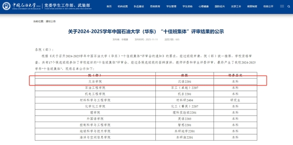 近日,经过班级申请、学院推荐、学校组织答辩,2024-2025学年中国石油大学(华东)“十佳班集体”评审结果发布,全校共有17个候选班级,我院汉语2201班以第一名的成绩成功入选。