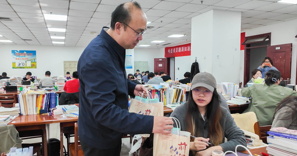 为进一步激发学院考研学子的备考热情、坚定考研信心、提振备考士气、传递关怀与力量,11月24日,太阳成集团tyc7111cc副院长冷凌、党委副书记陈熙、22级辅导员杨倩以及学生志愿者一行前往图书馆研读区慰问2026届考研学子,为正在紧张备考的学子们传递学院的深切关怀与坚实支持。