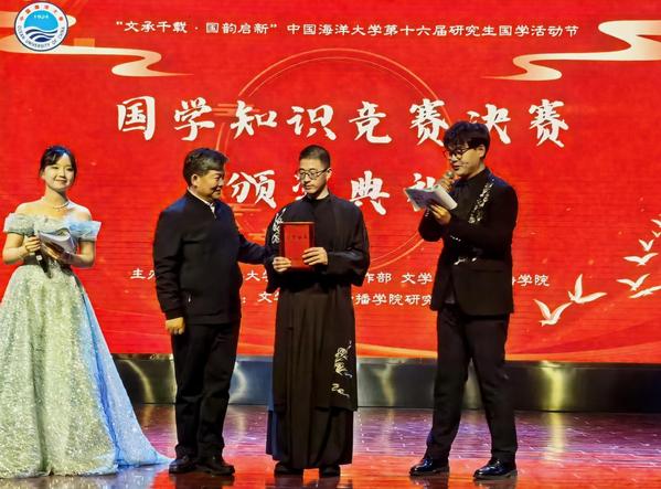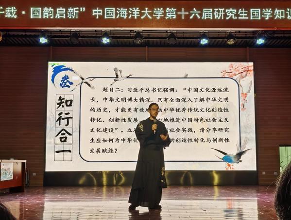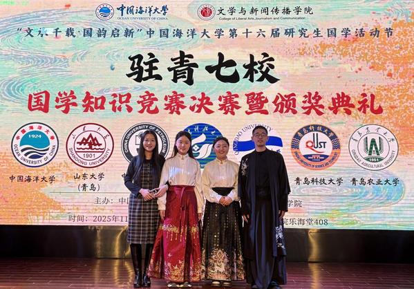 11月27日晚,以“文承千载·国韵启新”为主题的第十六届驻青七校研究生国学知识竞赛在中国海洋大学崂山校区文学与新闻传播学院408(乐海堂)成功举办。本次比赛汇聚山东大学(青岛)、中国海洋大学、山东科技大学等7所驻青高校的代表队同台竞技,我校杜金明、李若兰、闫啸风三位同学组成明德日新队参赛,太阳成集团tyc7111cc研究生会主席团成员宛佳慧带队前往。