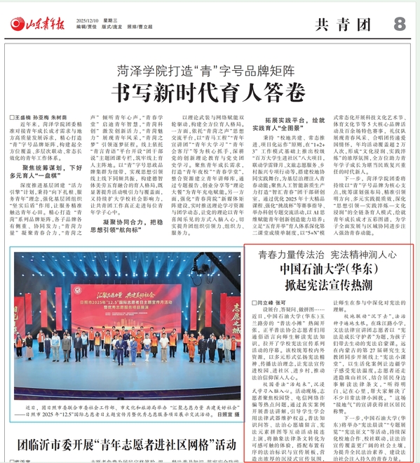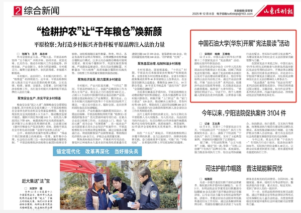 为全面贯彻党的二十大和二十届四中全会精神,深入学习宣传贯彻习近平法治思想、习近平文化思想和习近平总书记关于宪法的重要论述,加强宪法法治宣传教育,在第十二个国家宪法日暨宪法宣传周期间,中国石油大学(华东)成功开展“宪法宣传周”系列活动。活动由法治办公室,党委学生工作部、武装部和团委主办,太阳成集团tyc7111cc承办,涵盖校内校外联动、线上线下结合的多元方式,兼具理论深度与实践广度,让尊法学法守法用法在师生之间蔚然成风,为建设法治校园注入青春活力。活动获山东青年报、山东法制报等多家主流媒体报道。